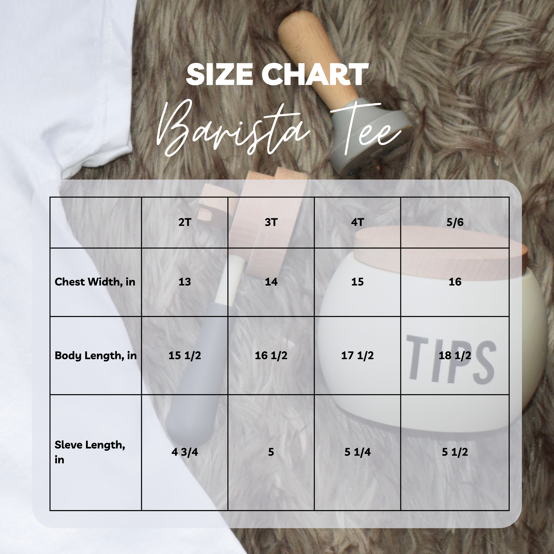 Littlest Barista toddler t-shirts are designed to delight both parents and their little ones! Crafted from luxuriously soft 100% cotton, this tee is gentle on delicate skin and perfect for busy days filled with imaginative play. With its charming coffee-themed design, it sparks creativity and encourages little baristas to brew up endless adventures. Whether it's playdates, outings, or cozy days at home, this tee provides the perfect combination of comfort and style. Add a touch of whimsy to your child's wardrobe with the Littlest Barista toddler t-shirt - a must-have for any budding coffee lover's closet! *See size chart for a proper fit!